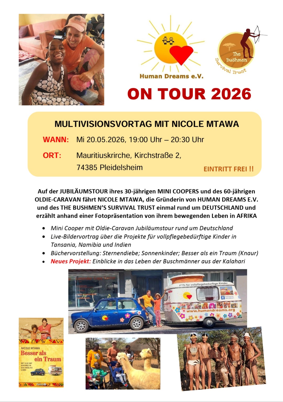Auf der Jubiläumstour ihres 30-jährigen MINI COOPERS und des 30-jährigen OLDIE CARAVAN fährt Nicole Mtawa, die Gründerin von HUMAN DREAMS E.V. einmal rund um Deutschland und erzählt anhand einer Fotopräsentation von ihrem bewegenden Leben in Afrika.